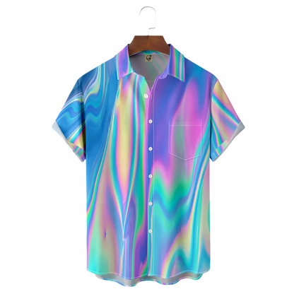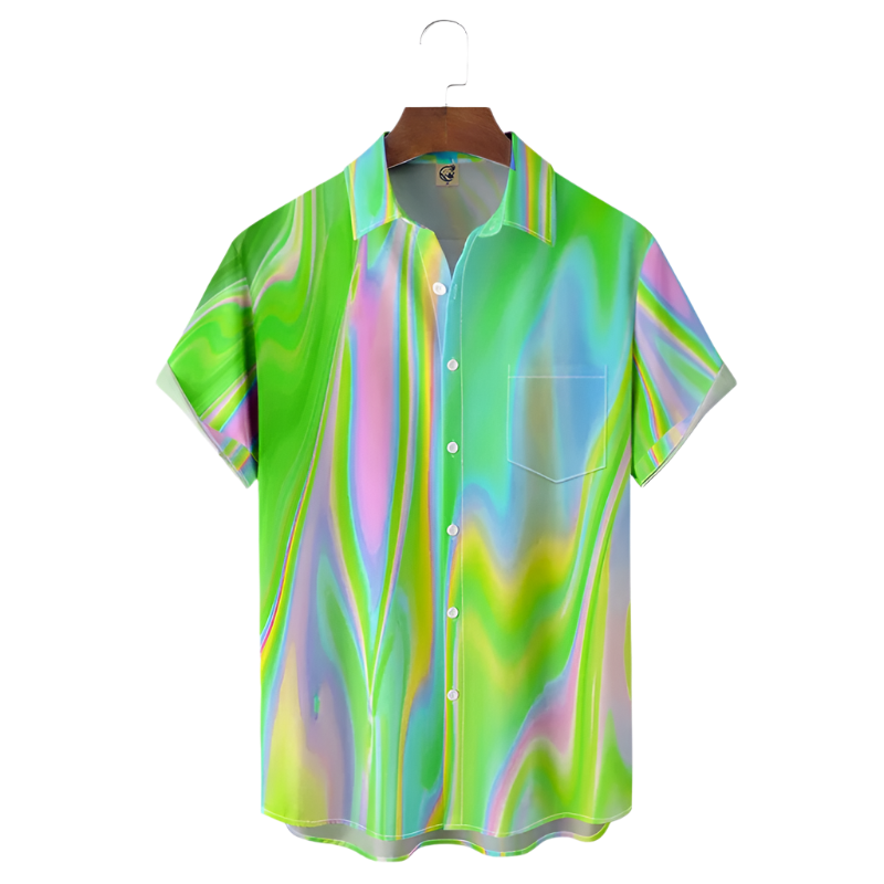 Shine in a retro holographic button down. Sexy, daring men’s resort style made for Temptation Cancún parties, Desire nights, and festival escapes.