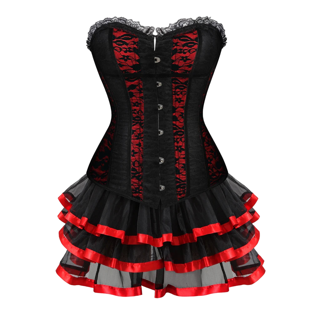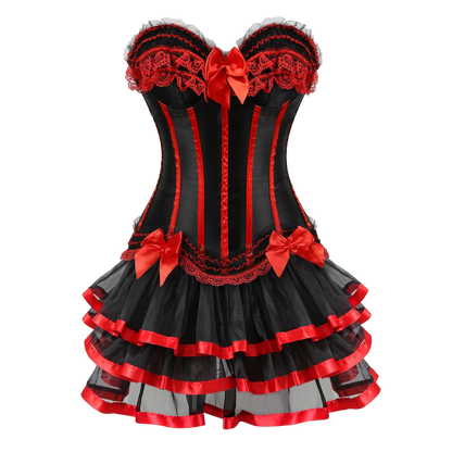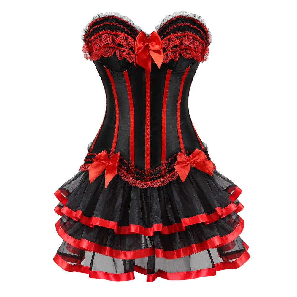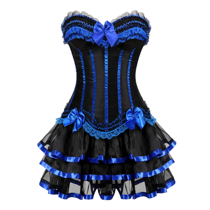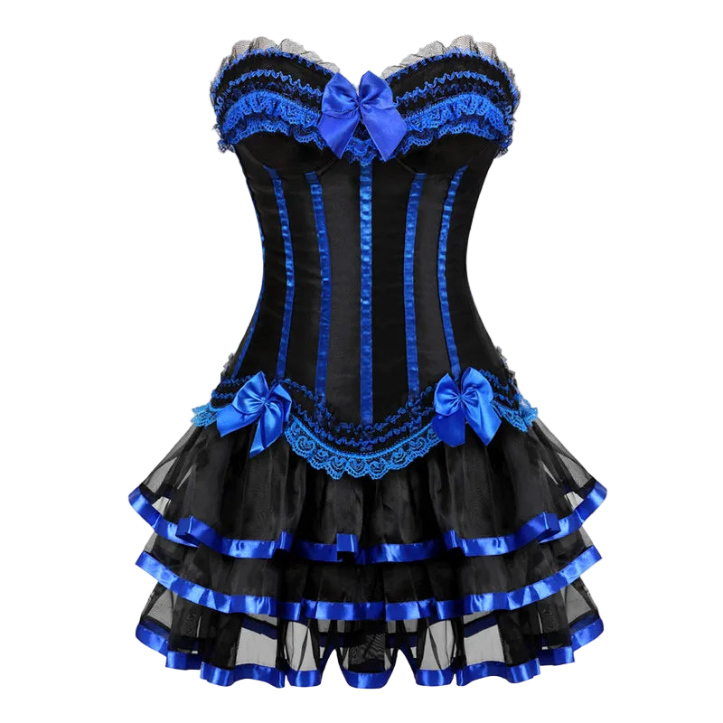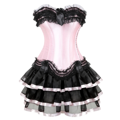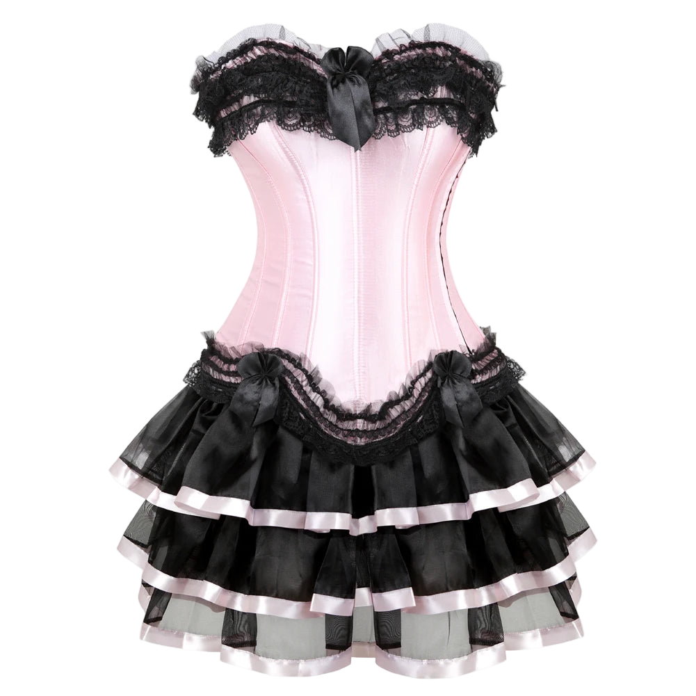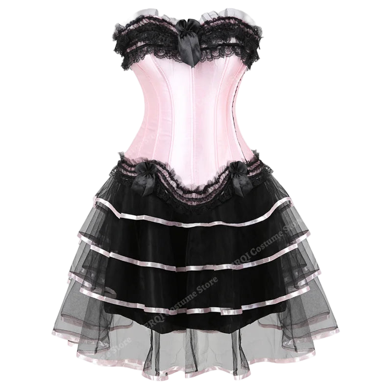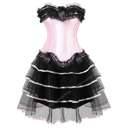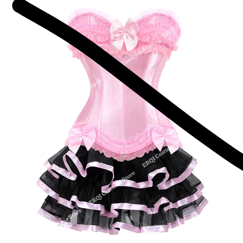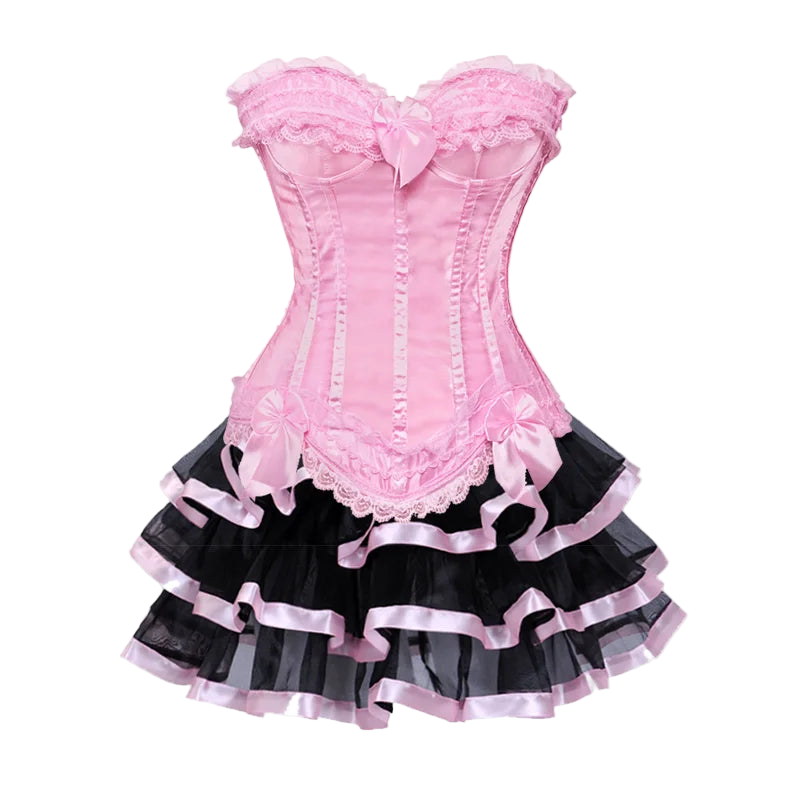 Feel like royalty in our pink Victorian-style corset with matching tutu skirt. Features elegant lace-up design and overbust styling. Available in plus sizes. Perfect for resort theme nights and romantic evenings.
