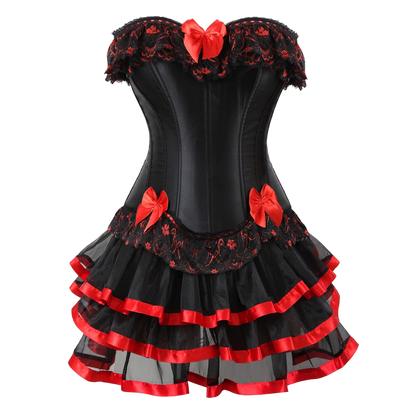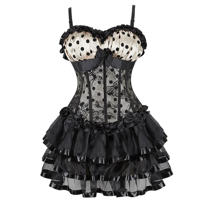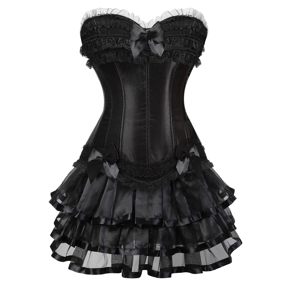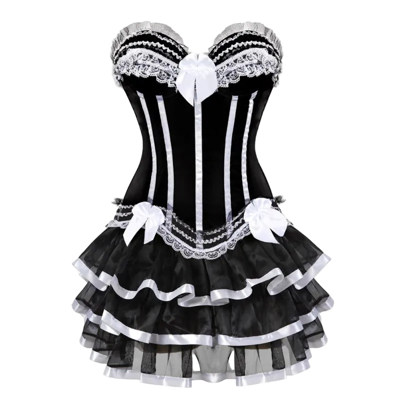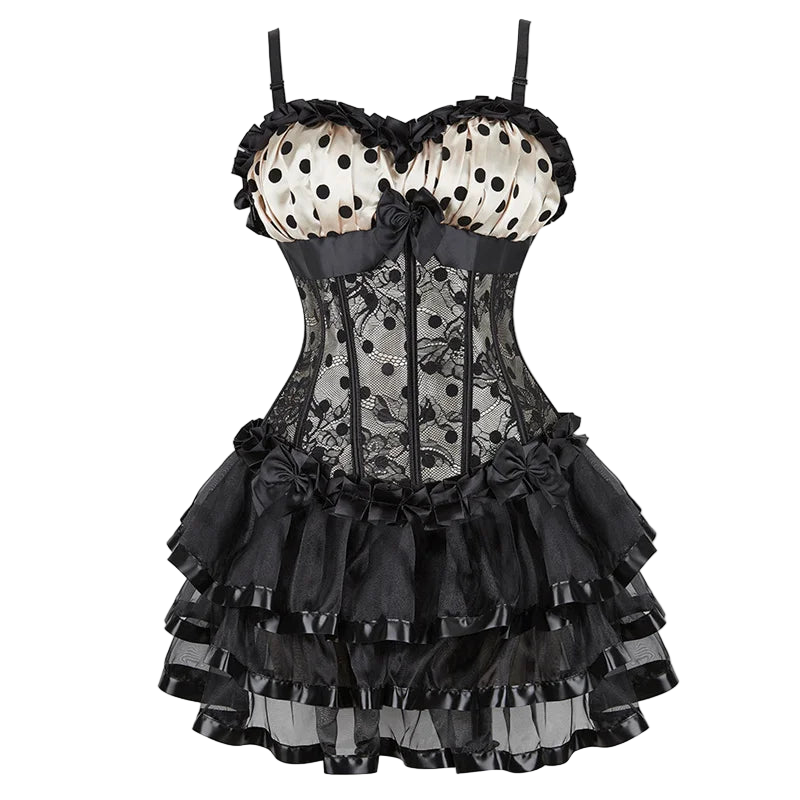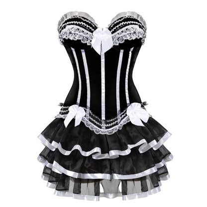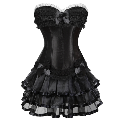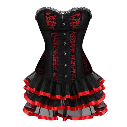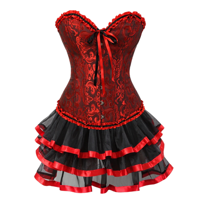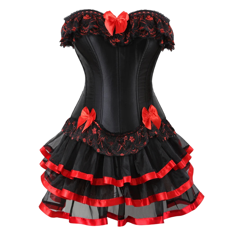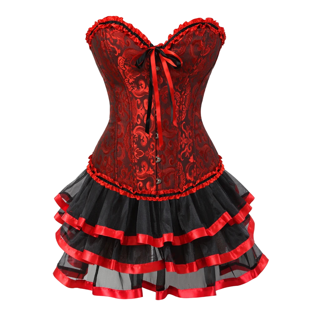Feel like royalty in our pink Victorian-style corset with matching tutu skirt. Features elegant lace-up design and overbust styling. Available in plus sizes. Perfect for resort theme nights and romantic evenings.