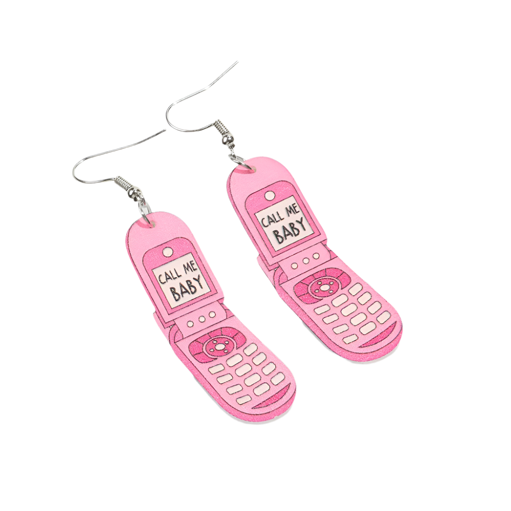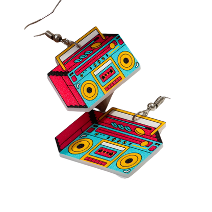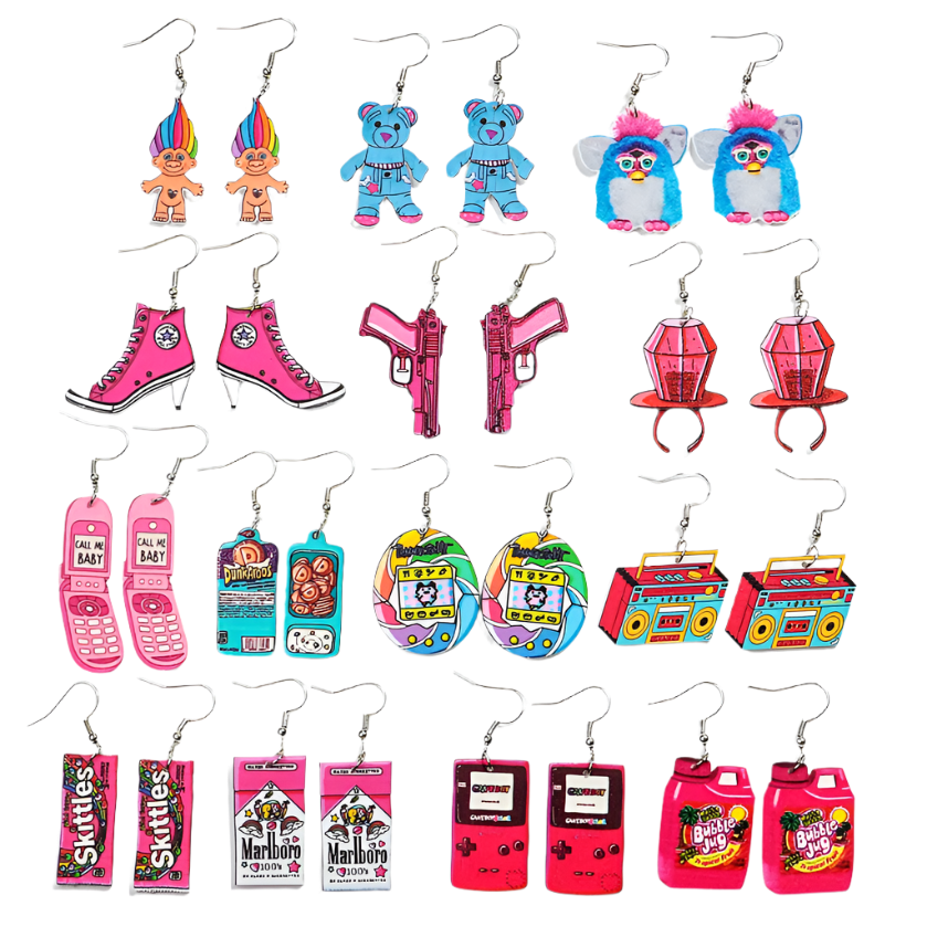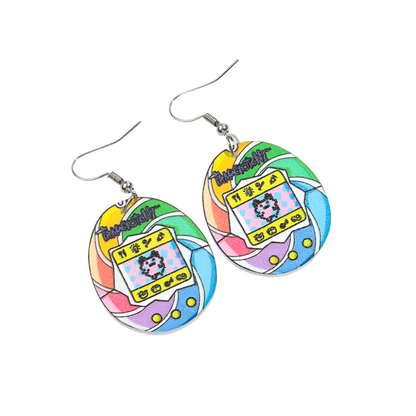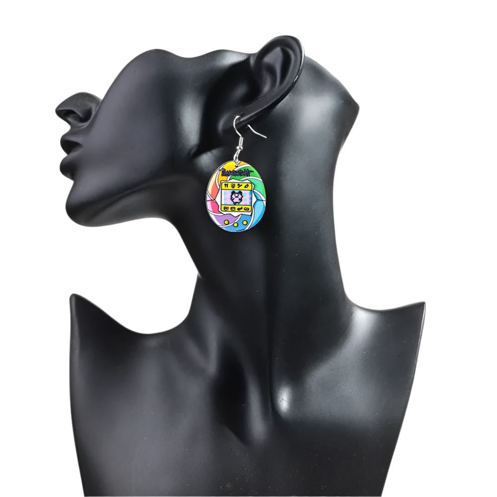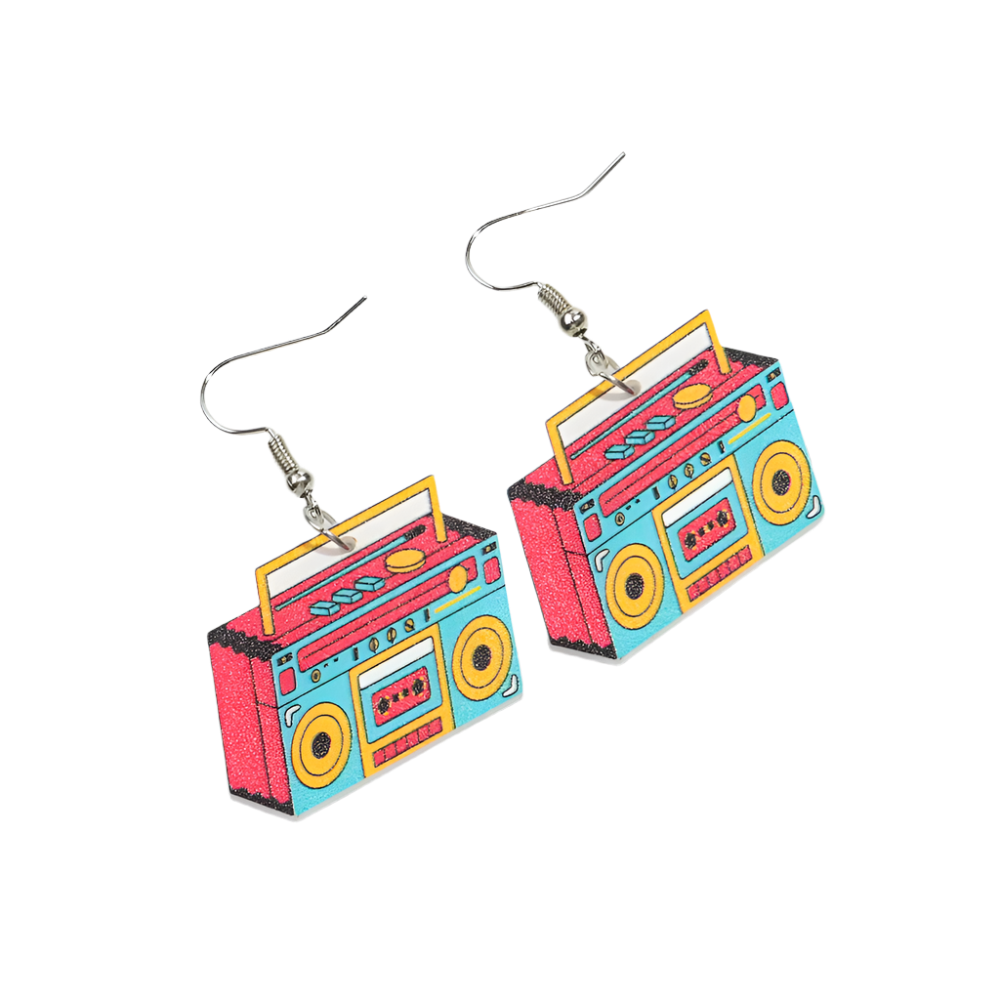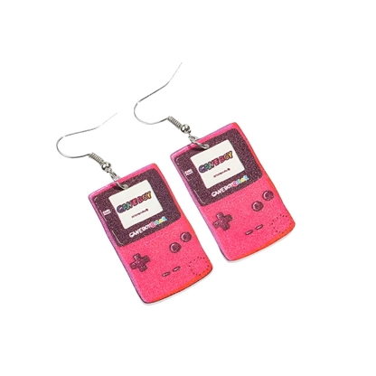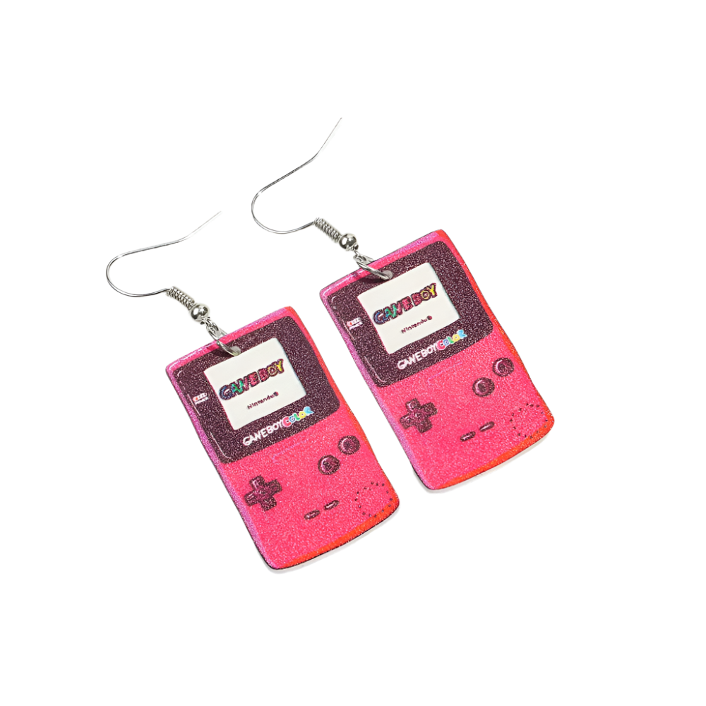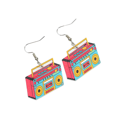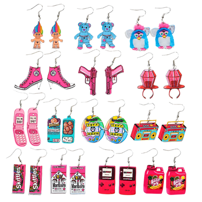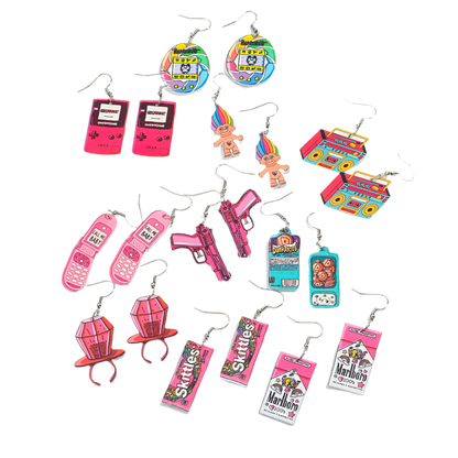 Nostalgic Y2K-inspired acrylic earrings featuring cute pink gaming motifs. Perfect for resort parties, retro theme nights & vintage fashion. Fun high heel & radio design jewelry.