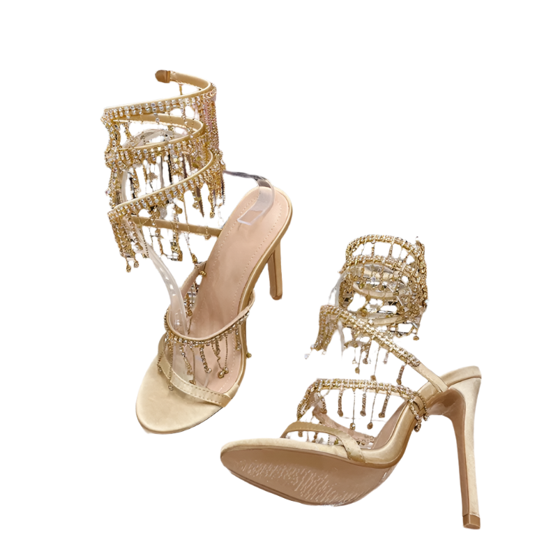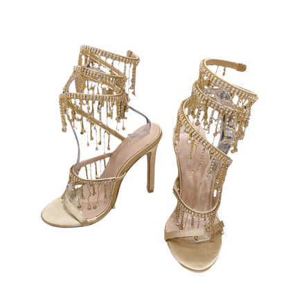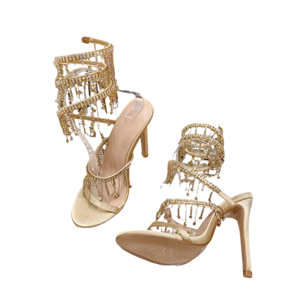 Elegant golden crystal tassel wedding sandals with twining stiletto heels and open toe design. Perfect banquet shoes for resort weddings and formal events.