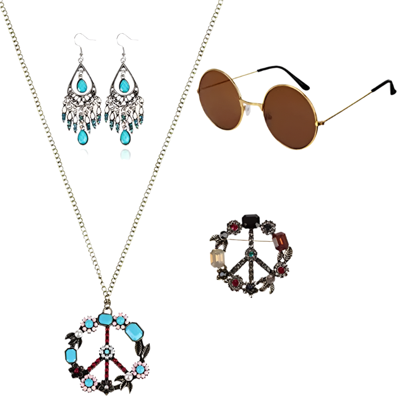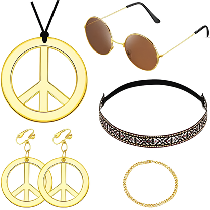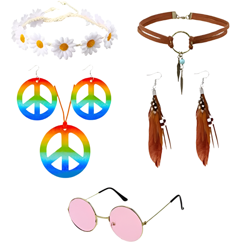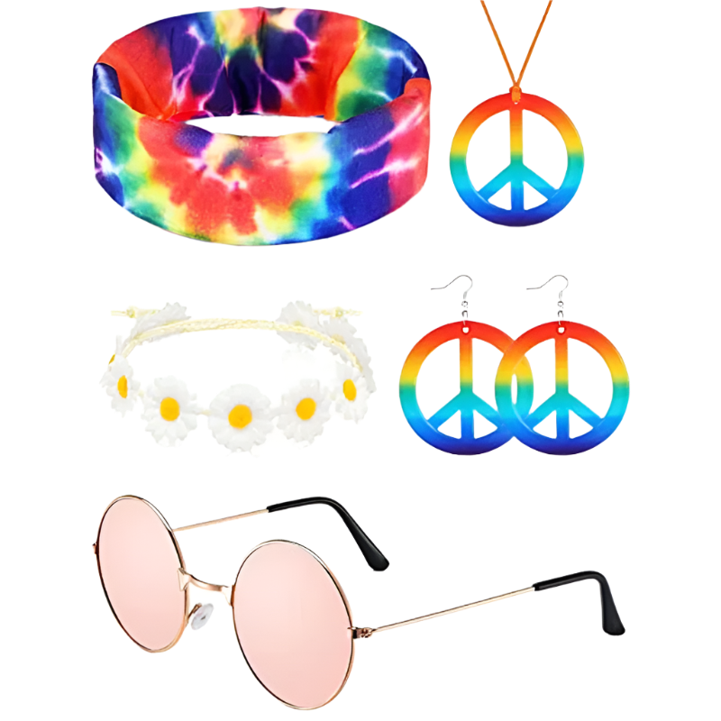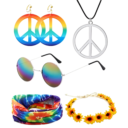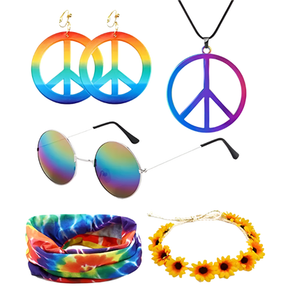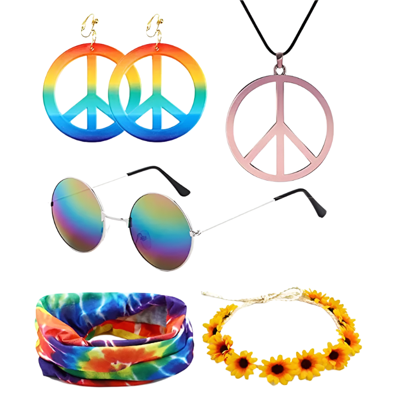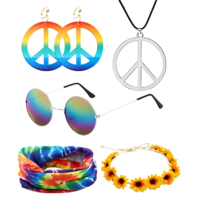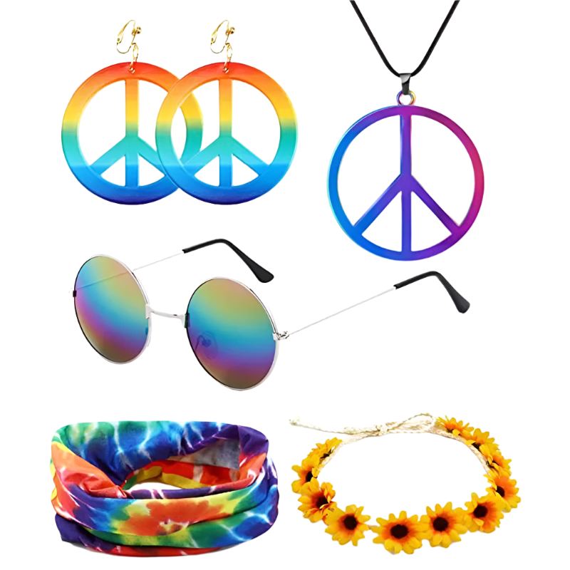 Spread love and good vibes in this rainbow peace hippie set featuring 70s retro theme night styling and groovy peace sign design. Perfect for bringing flower power energy to resort retro nights and channeling your most free-spirited hippie goddess energy with rainbow peace appeal.