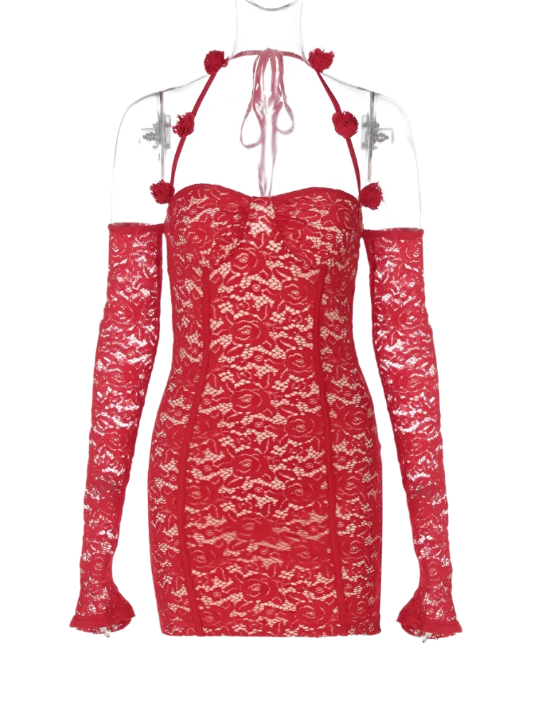 Red Lace Off-Shoulder Halter Dress