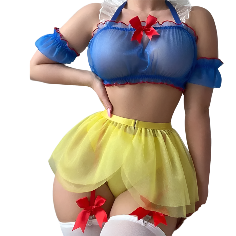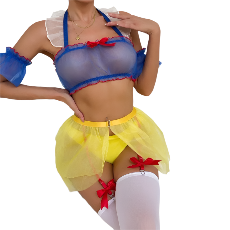 Be the fairest of them all in this mesh Snow White inspired costume set with fantasy princess theme night styling and enchanted forest design. Perfect for bringing fairy tale magic to resort costume nights and channeling your most captivating storybook goddess energy with mesh sophistication.