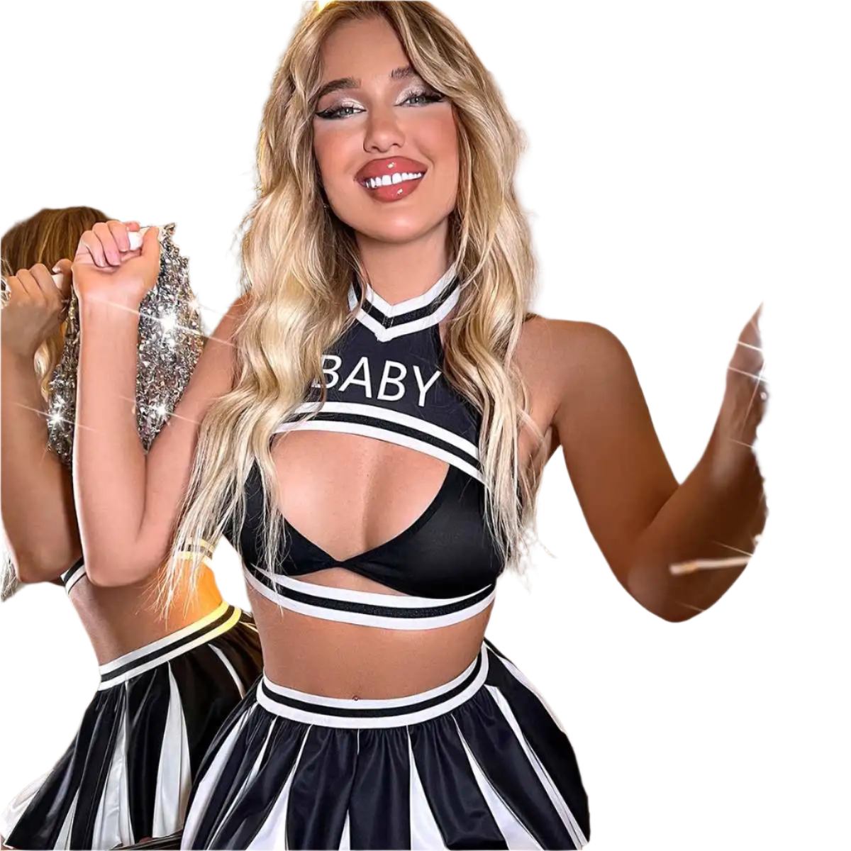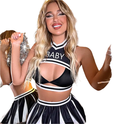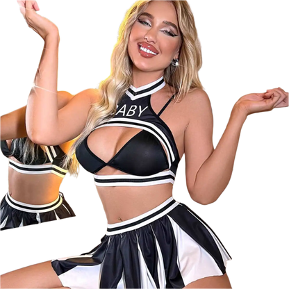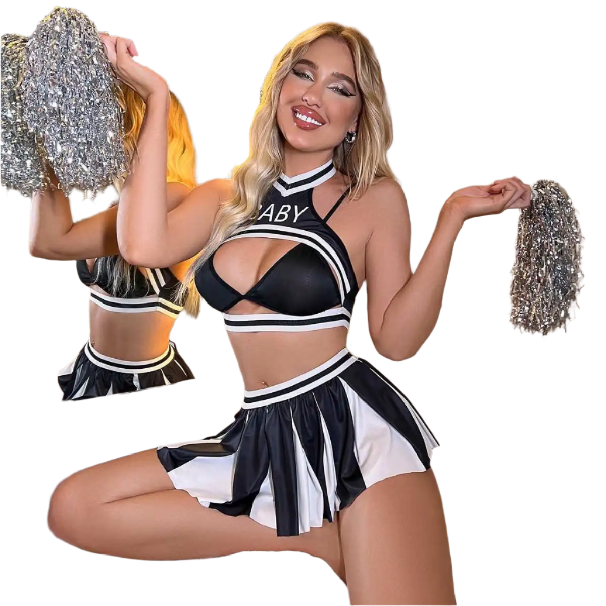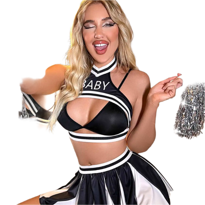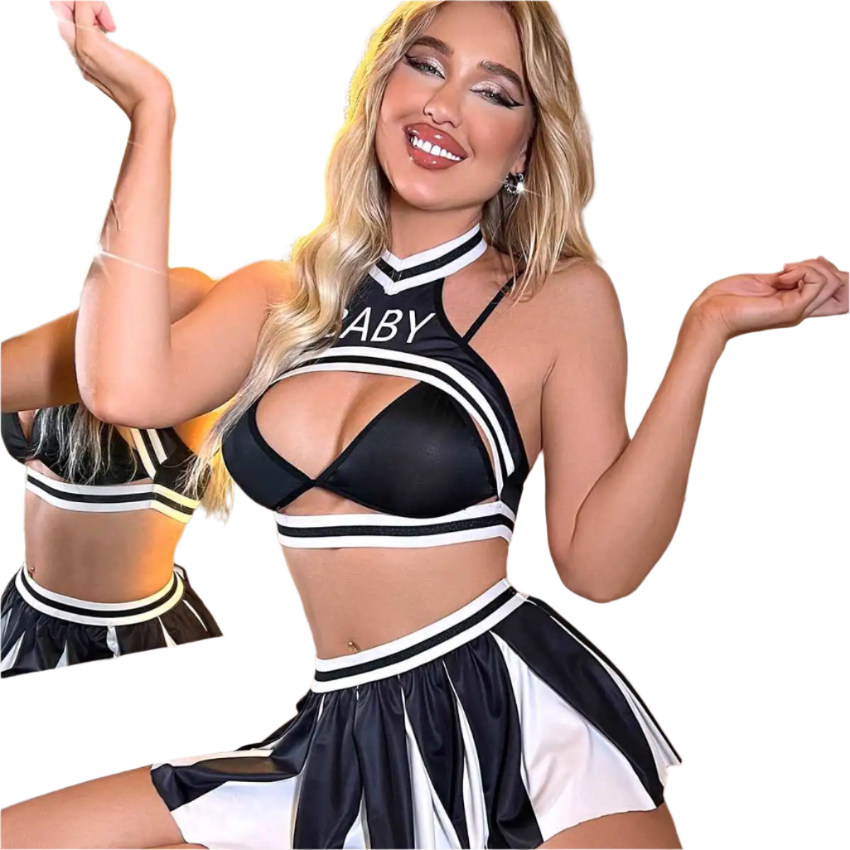 Lead the cheer in our sophisticated two-piece cheerleading dress featuring adult lady styling and schoolgirl cosplay design. Perfect for theme party entertainment, cosplay events, and cheerleader-themed resort nights. Combines authentic cheerleader appeal with premium costume craftsmanship and flirty lingerie elements.